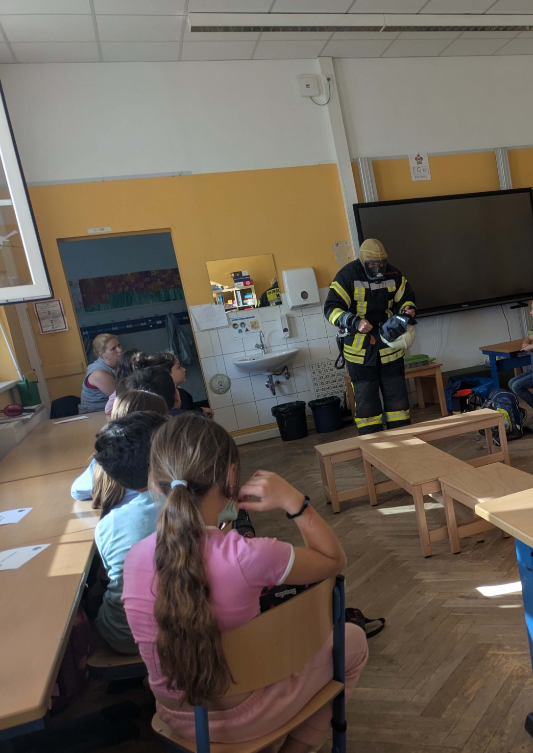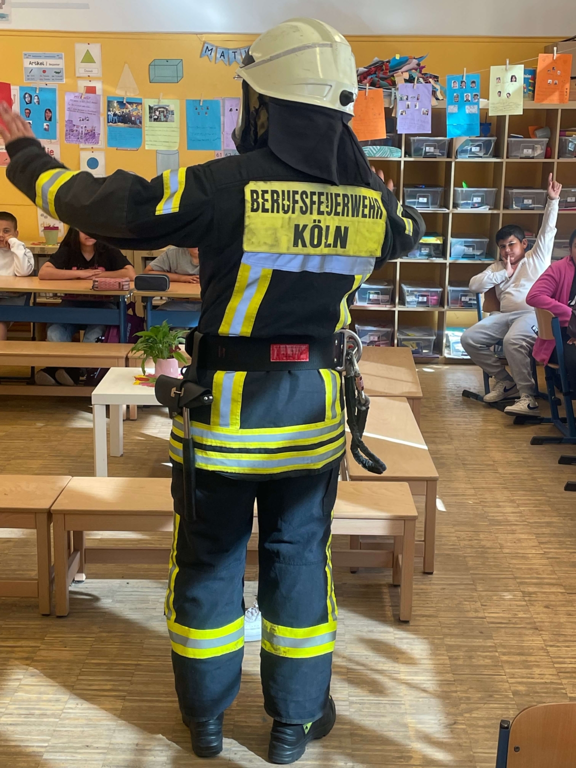 Am 3. Juni 2025 war Brandmeister Fabian Hannak zu Besuch in den 3. Klassen. Feuerwehrmann Fabian hatte sich an seinem freien Tag die Zeit genommen den Kindern aus seinem Berufsalltag zu erzählen und die vielen Fragen der Kinder zu beantworten. Er hatte sogar einen Teil seiner Ausrüstung als Feuerwehrmann mitgebracht und hat sich vor der Klasse seine Montur aus Sicherheitsstiefeln, Hose, Jacke, Atemmaske und Helm angezogen. War das beeindruckend!