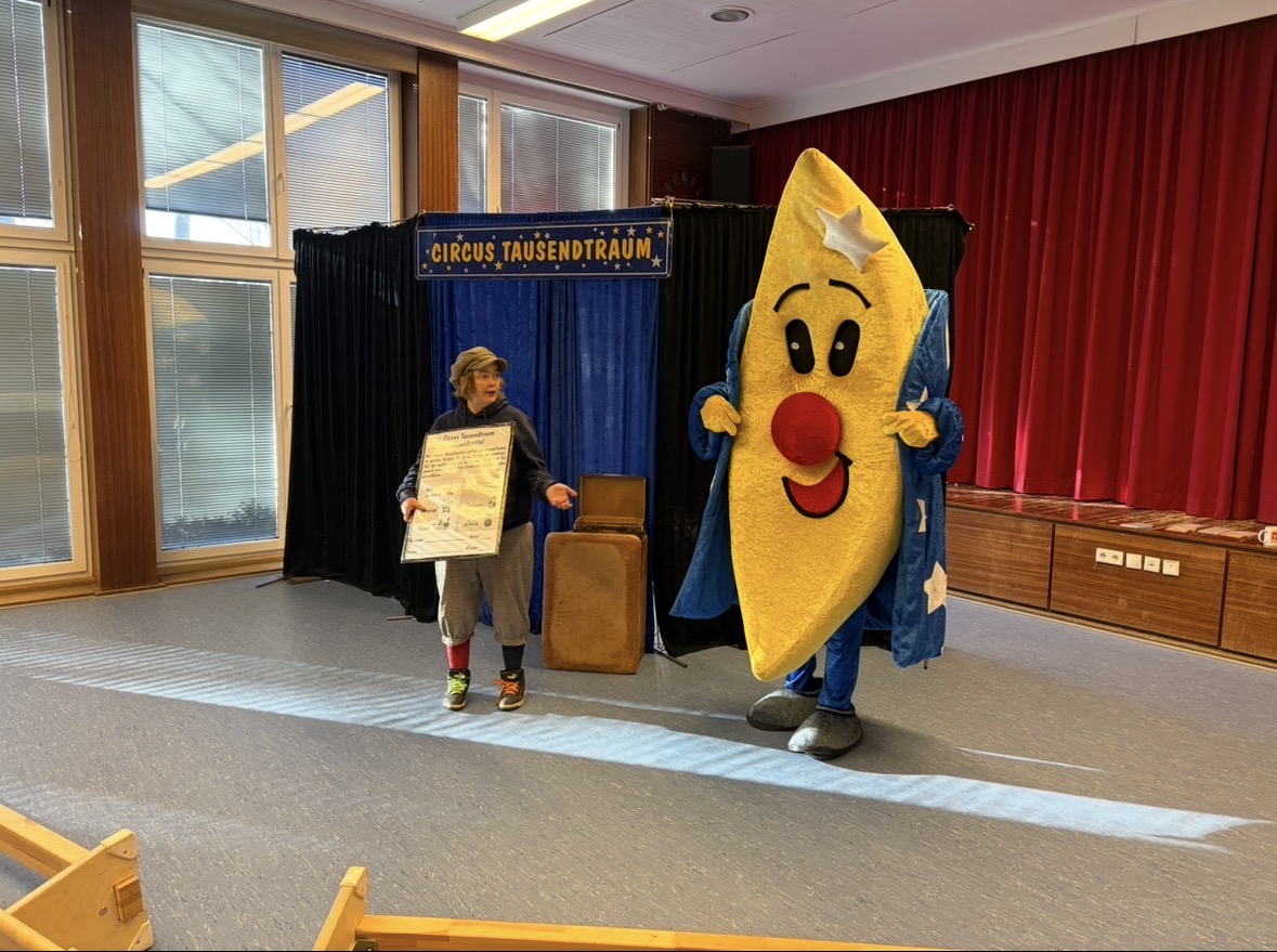 Denn wir bekamen besonderen Besuch: Luno, das Mondmännchen-Maskottchen des Circus, schaute bei uns vorbei! Mit viel Charme, Witz und guter Laune stimmte Luno, gemeinsam mit der Projektleiterin, die Kinder auf die bevorstehende Zirkuswoche ein. In einem kleinen, lustigen Theaterstück erzählte er den Schülerinnen und Schülern die wichtigsten Informationen rund um das Zirkusprojekt. Dabei erfuhren die Kinder, was sie in der Projektwoche erwartet und wie eine echte Zirkusaufführung entsteht. Besonders spannend war die Vorstellung der einzelnen Trainingsbereiche. Luno erklärte anschaulich, was sich hinter den verschiedenen Gruppen verbirgt – von Clowns über Jongleure und Bodenakrobaten bis hin zu Zauberern, Artisten und weiteren spannenden Zirkusrollen. Am Ende durften alle Kinder zwei Wünsche abgeben, in welcher Trainingsgruppe sie am liebsten teilnehmen würden.